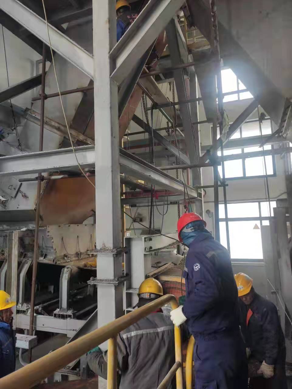在石英砂作業過程中,由于料斗和溜筒壁磨損過大,會出現貨物撒漏的現象,需要及時對轉運站料斗和溜筒壁更換耐磨鋼板,同時,需要對改向滾筒進行包膠。包膠是一件耗時又費力的事,按照一般技術操作要求,必須要先把滾筒拆下,送到廠家進行包膠,然后再運回來進行安裝。從拆到安裝最快需要一周的時間。為順利完成生產工藝設備設施保養維護工作,公司技術管理人員放棄休息時間,成立攻關小組,通過查閱相關資料、反復研究探討,最終確定直接在作業現場進行包膠的方案。在生產廠家的協助指導下,僅僅用了兩天時間就完成了滾筒的包膠,為生產作業搶得了更多的時間。